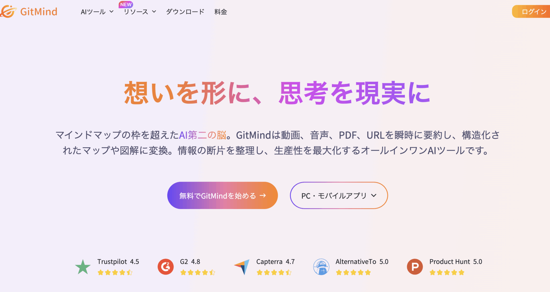 GitMindは、Web・PC・スマートフォンに対応し、直感的な操作で初心者でも使いやすいツールです。AI機能により、テキストやPDF、URLなどから自動でマップ生成が可能です。無料版は作成数に上限があるため注意が必要ですが、AIで効率化したい人に向いています。