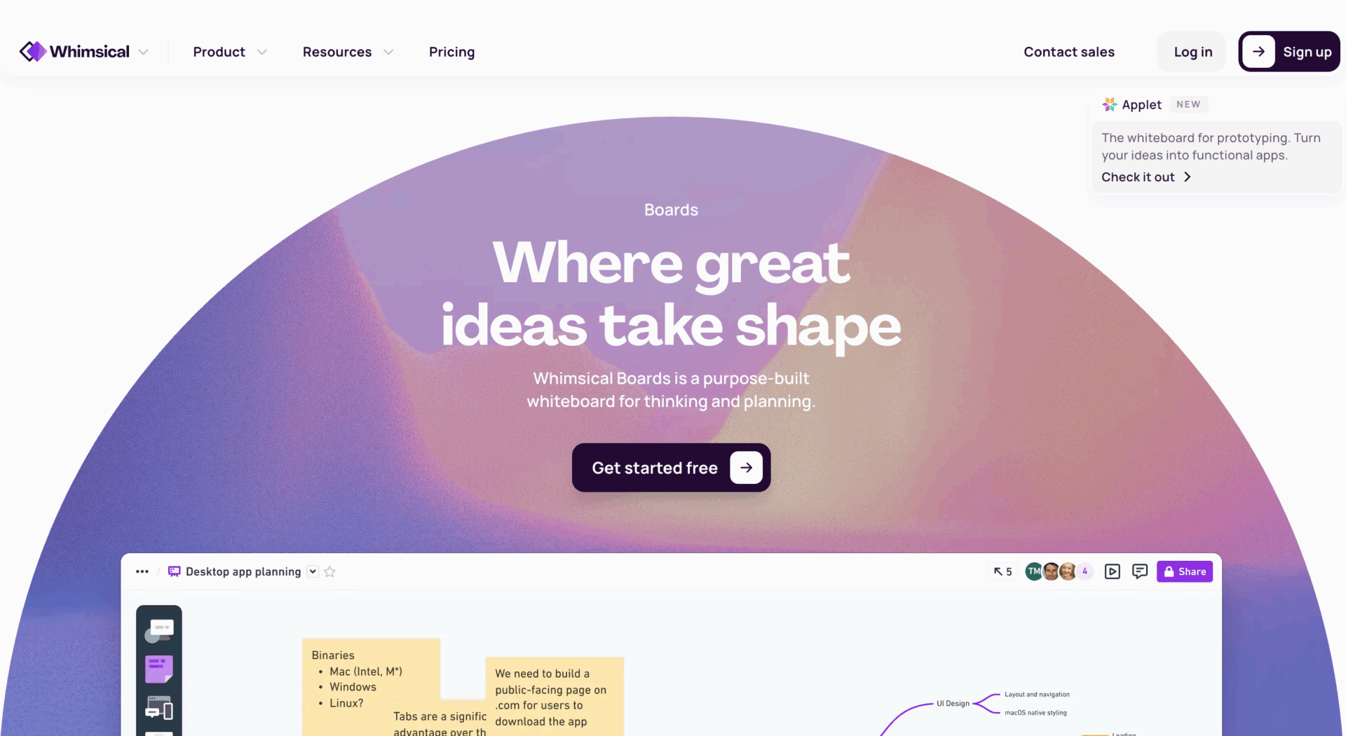 Whimsicalは、マインドマップに加えフローチャートやワイヤーフレームも作成できるオールインワン型ツールです。操作が軽く、AI提案機能で関連テーマを自動生成できます。無料プランには制限がありますが、個人利用ならボード数は無制限で、気軽に試したい人に向いています。