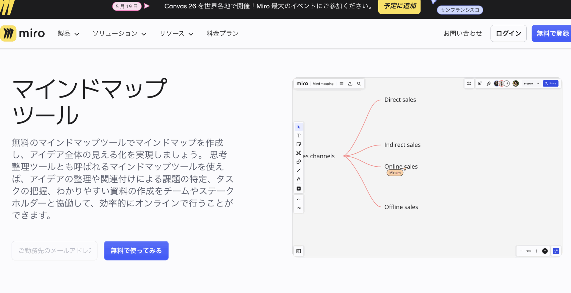 Miroは、マインドマップ作成に加えコメントやチャット機能を備えたオンラインホワイトボードです。ブラウザで利用でき、各種ツールとも連携可能です。無料版でも基本機能は使えますが、保存数や共有範囲に制限があります。英語中心の表示に注意が必要です。