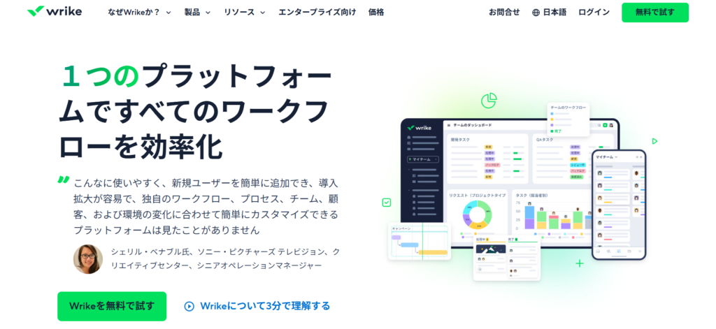Wrikeは、オンラインで活用できるプロジェクト管理・コラボレーションツールです。プロジェクトの調整やタスクの優先順位確認、進捗管理やチームメンバーとのコラボレーションを実現できます。