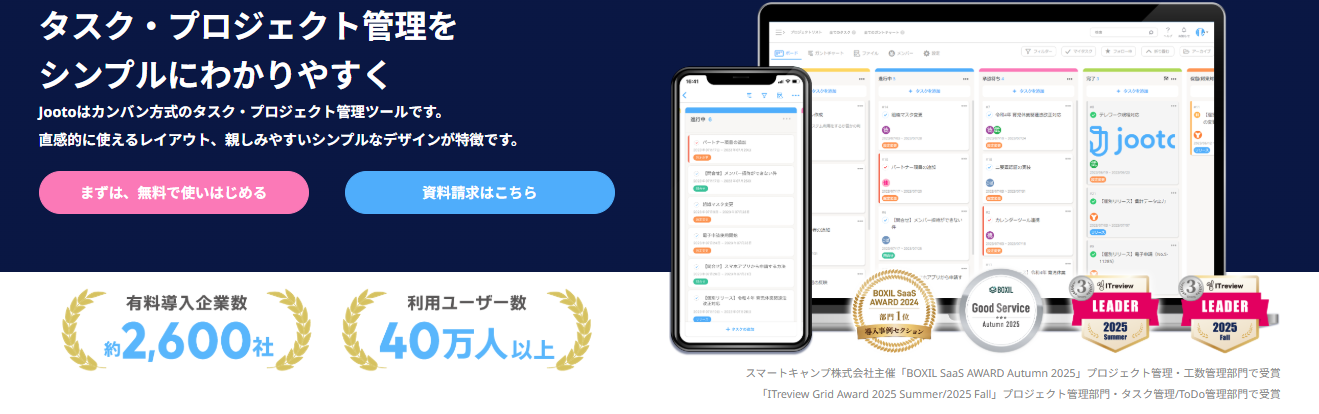 Jootoは、タスク・プロジェクトをシンプルにわかりやすく管理できるツールです。カンバン方式を採用しており、直感的に使える操作性が特徴です。