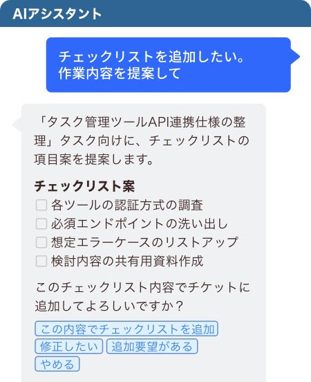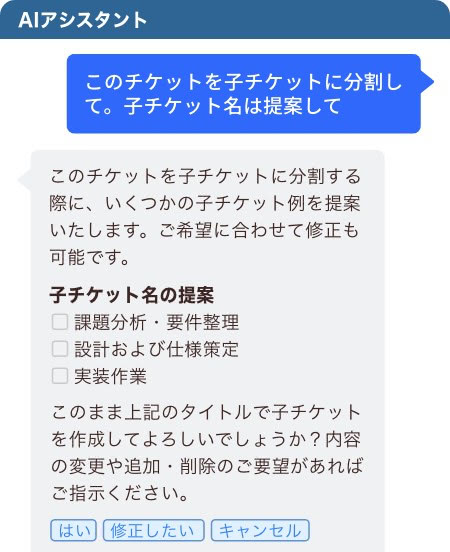 チケット内容をもとにAIが作業の完了条件を提案します。抜け漏れを防ぎ、業務の品質を⾼めます。