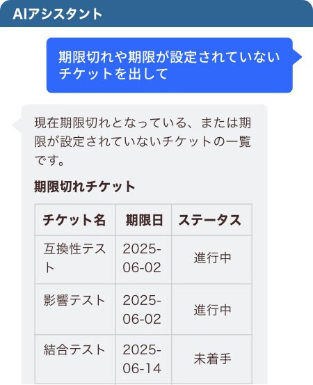 確認したい条件を伝えるだけで、必要なチケットを即座に表⽰します。「〇〇に関連するチケットを探して」「開始日が近い担当者未設定のチケットを教えて」と伝えるだけで、今まではできなかったチケットの題名、説明、コメントの横断検索や絞り込みができるようになりました。