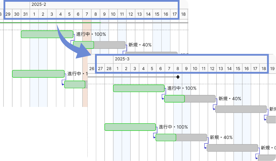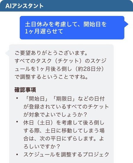 ガントチャート全体のスケジュールをAIが⼀括で調整。「開始⽇を1週間延ばして」といった指⽰にも⾃然な対話で対応します。