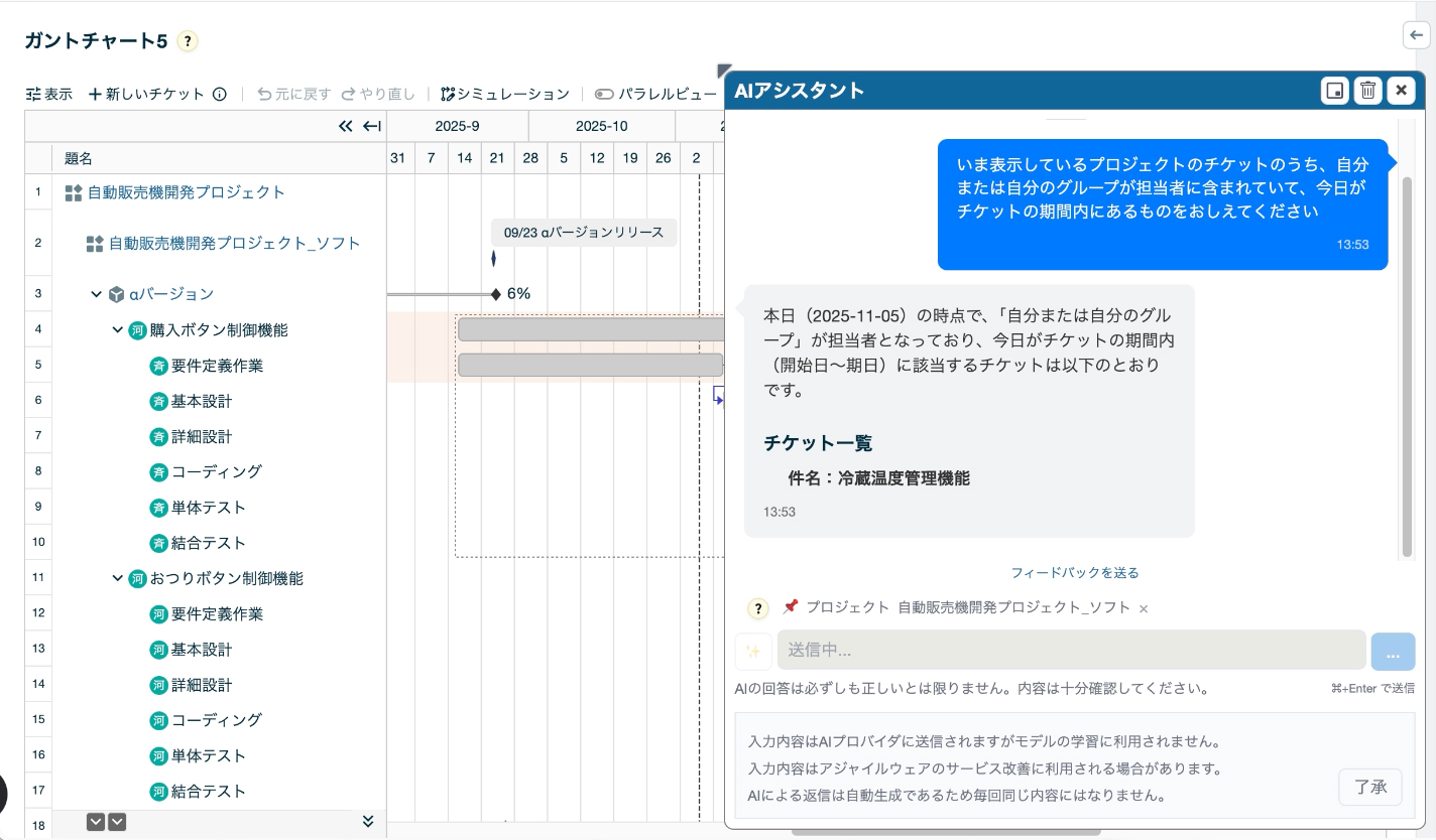 直感的な操作画面上に出現するチャットパネル「AIアシスタント」から、AIに話しかけるだけでチケットの作成・更新・検索・スケジュール調整が可能。プロジェクト管理・タスク管理に慣れていない方もわかりやすいよう、チャットメニューにはよく使う質問をご用意。ボタンひとつでAIに指示を出すこともできます。ツールを習熟していなくても、「今日やるチケットを教えて」「遅れそうなタスクを洗い出して」など気になったことをそのまま聞けば答えてくれるので、画面遷移や検索による思考の流れを止めません。