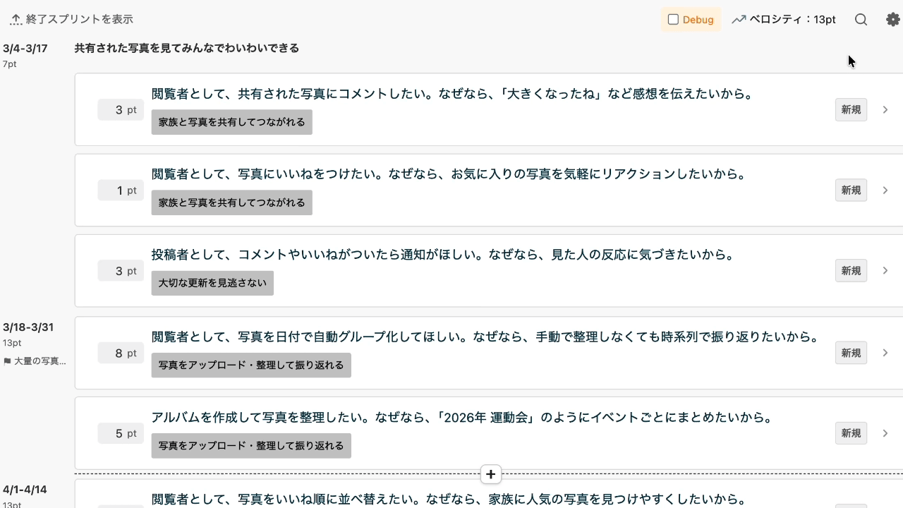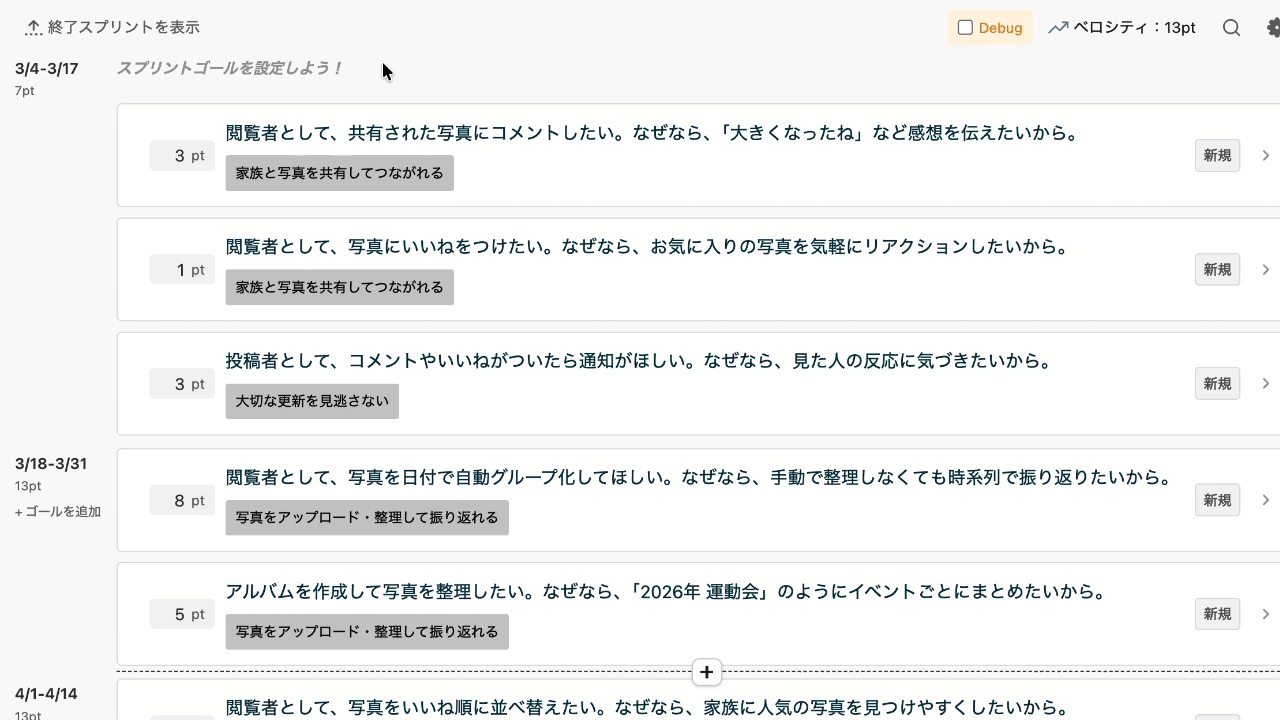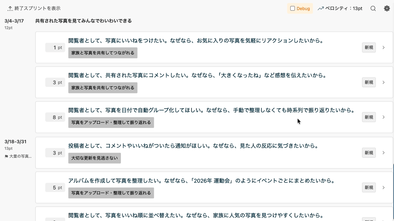 「次のスプリントにどこまで入るか」が即座に可視化され、無理のない計画を立てられます。