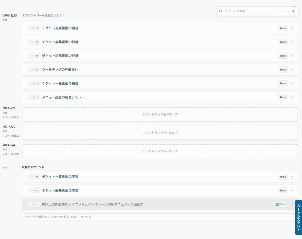 Neoバックログでは、スプリントの自動生成、ベロシティに基づきチケットを自動でスプリントに振り分け、ドラッグ&ドロップでの優先順位管理をシームレスにしました。