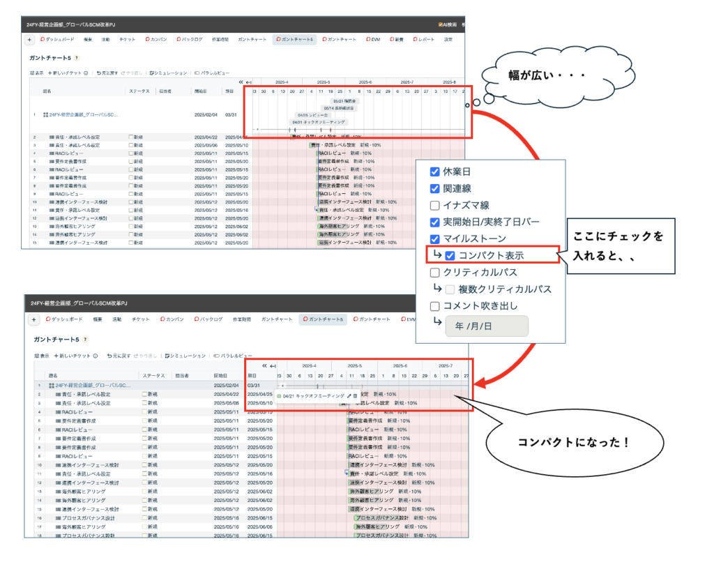 これにより、マイルストーンが重なって表示される場合でも、コンパクト表示にすることによりガントバーエリアを広く使うことが出来ます。
