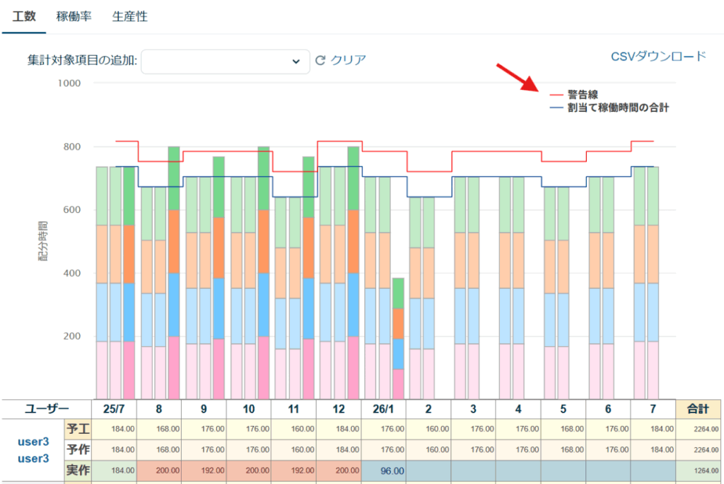 • 集計対象ユーザーの稼働時間の合計線・集計対象ユーザーを基準とした警告線